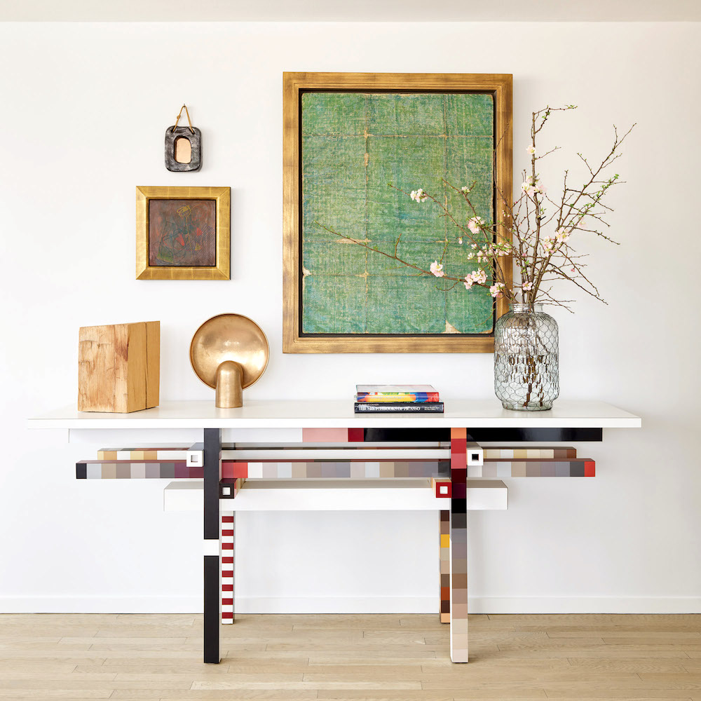 Los Angeles-based interior designer, Stephan Jones, was instantly captivated when he spied the late 1980s multi-colored laminate console table by David Best through a shop window in Montecito. “I had to have it,” he says, noting Best is renowned for his astonishing temples at the Burning Man festival. “This piece needs to be featured.”