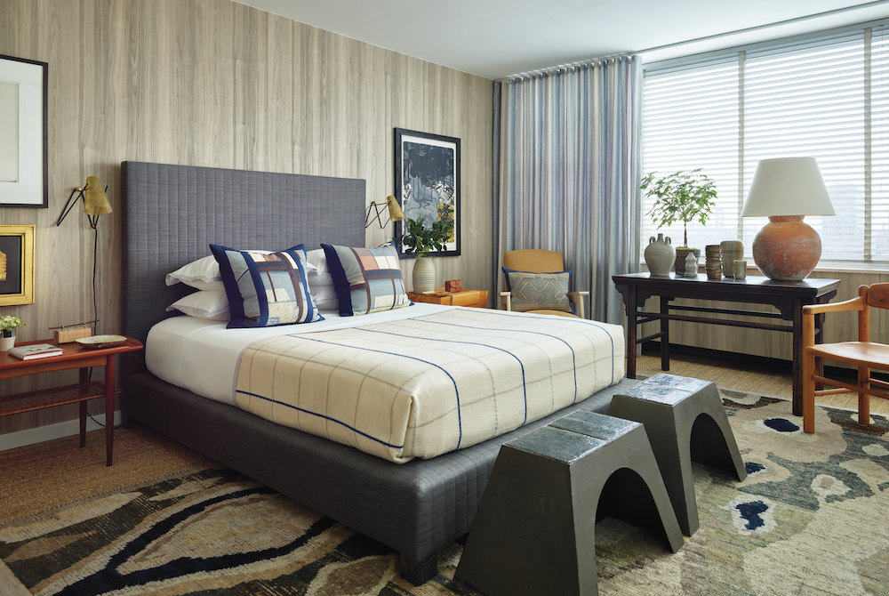 A pair of brutalist steel stools with tile tops, from a shop in Los Angeles, add to the mélange in the primary bedroom, which has a faux bois wallcovering that resembles wood paneling and wall-to-wall seagrass carpeting accented with a large-scale patterned area rug with a painterly motif.