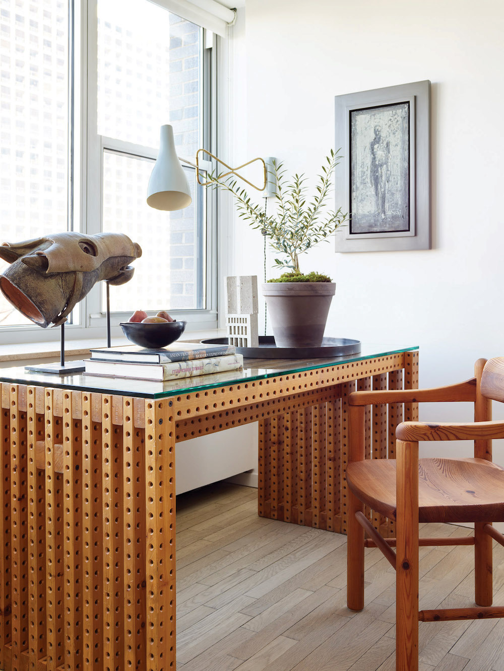 In the living room, an antique Khotan rug with green and persimmon tones anchors a linen-covered St. Thomas-style sofa and a pair of solid Elm chairs with velvet cushions and pillows covered in a vintage yellow silk that once lined a kimono. Near the window, a glass-topped Italian constructivist desk creates a spot to enjoy the north-facing views of the lake and treelined neighborhood. “These pieces become bits of architecture,” he says.