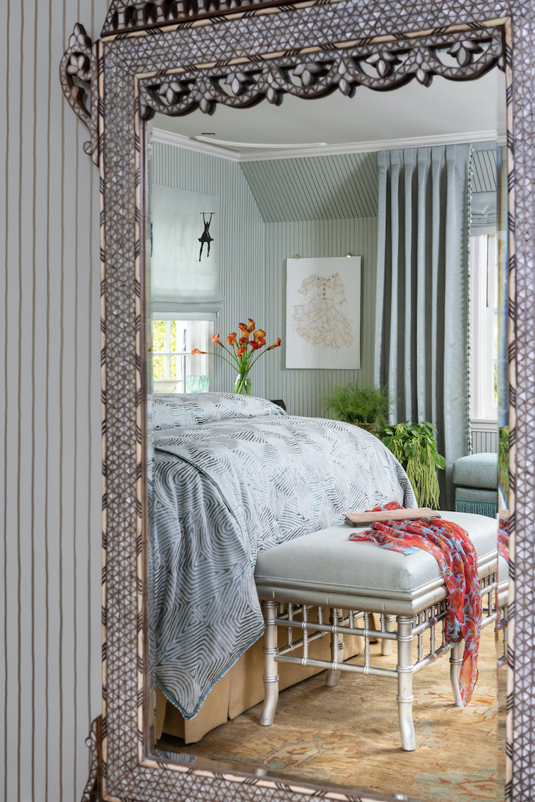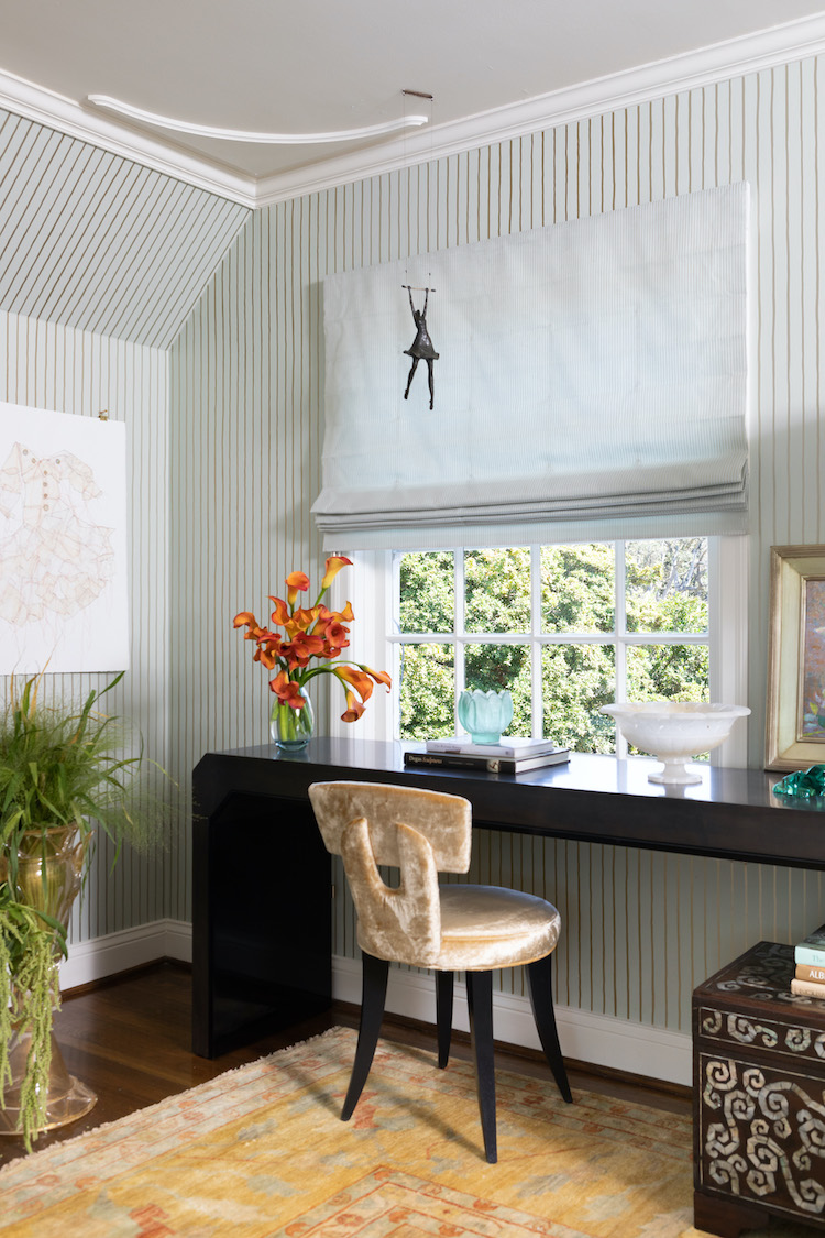 Stephanie: I have done 2 showhouses. One small space (powder room) and one large (bedroom & closet). Each proved its own challenges. But something I didn’t consider when taking this year’s bedroom & closet was the amount of furniture, accessories & fresh flowers that are required to make it a finished and inviting space. That was an eye-opening experience & proved time-consuming.