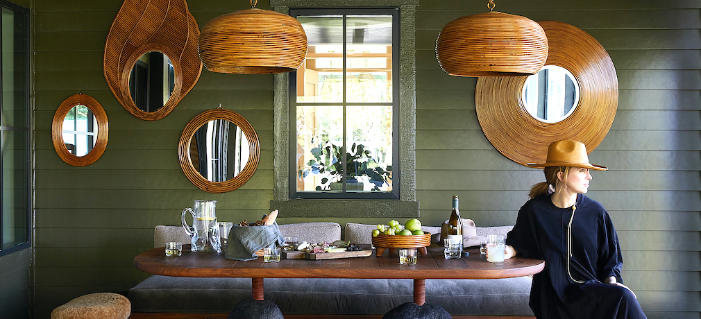 Overall, Wirth kept the color palette neutral and added some drama in select rooms, like the office, and notably, on the deep-green, screened porch. She shares, “The porch was really the shining glory for me. We sourced furniture from California and some vintage pieces from Italy. And that deep green is reflective of the natural surroundings but adds lots of impact.” The brick floor is painted an almost-black dark green that Wirth also used in the mudroom. The deep colors prevent the porch, which is adjacent to the dining room and kitchen, from getting in the way of the view.