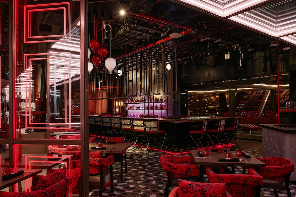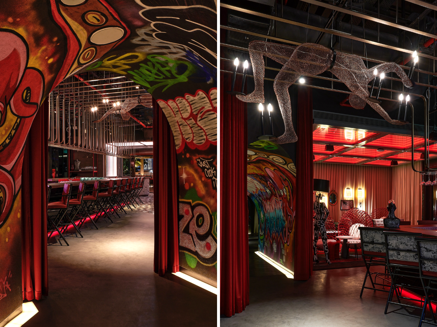 Guests embark on this journey through a container-inspired metal door, greeted by playful round hanging chairs that set the tone for a circus-inspired ambiance. A zig-zag zebra crossing, reflecting in the many mirrors in the arrival area, leads you to the unexpected through a tunnel simulating a graffiti-filled back alley. At the end of the tunnel, a feature acrobat ceiling light by Kenneth Cobonpue intrigues the guests of the upcoming spectacle.