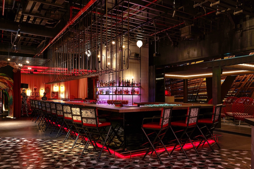 Concrete GRG counters, resembling curtains and upholstery, add another dimension to the materials used in the main dining space, where organized chaos prevails. Suspended tables support Kenneth Cobonpue acrobat lamps, while red chairs upholstered in graffiti-style designs by Jean Paul Gautier add a touch of street art. Large scale terrazzo breaks up the flooring to create more chaos, resembling broken cobblestones on a busy street.