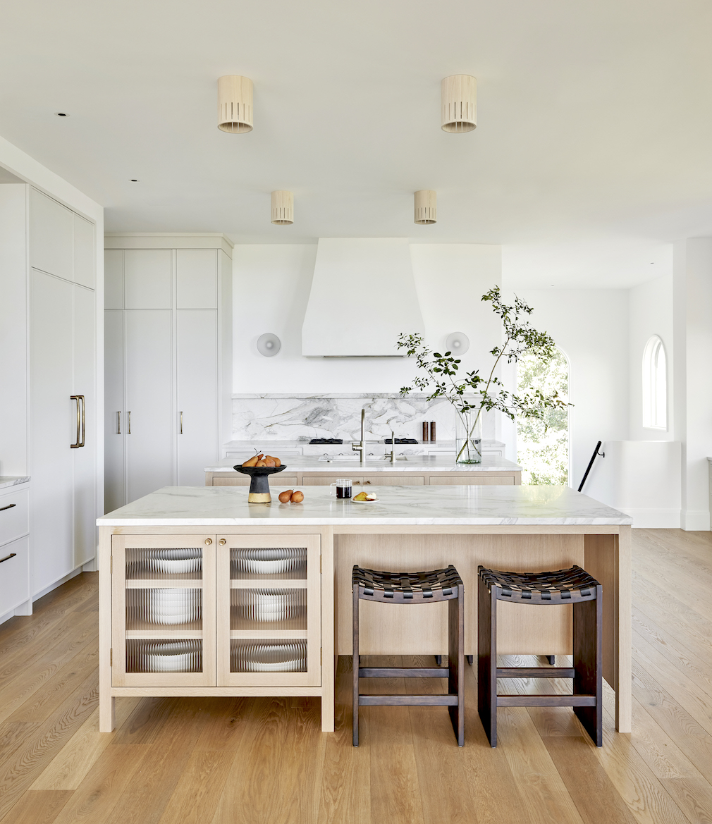 Outfitted with a lot of dark wood and heavy beams, the house struck a rustic pose, one more ersatz than authentic. To deliver on their clients’ desire for a lighter, more California-inspired look, the design team took hammer and crowbar to the place while maintaining much of the original layout. “The coarse, synthetic stucco walls were replaced with drywall and Portola’s Roman Clay organic gypsum plaster,” describes Kristen Ekeland, Principal, Studio Gild. “To infuse a feeling of calm and unity throughout, the palette was limited to natural oak flooring and millwork and soft white paint colors, such as Farrow & Ball’s Shaded White. To add warmth and age, burnished brass and oil-rubbed bronze became the metal of choice for all hardware and decorative lighting.”