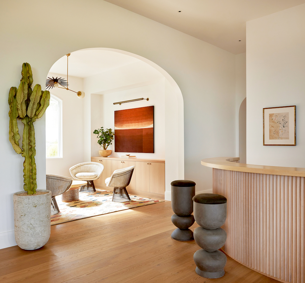 Throughout the house, relatively simple strategies provided big benefits. Rather than remove or reorient the great room’s awkward, diagonally-set fireplace, Ekeland stripped its stone cladding and changed its profile with an application of plaster laid on in a gentle curve. This feature now comes off as a part of the conversation, rather than an introvert wedged weirdly in the corner. And the office/den, the terminus of the primary bedroom corridor, is painted in Dunn-Edwards Black Pool, which generates an almost volumetric contrast to the home’s lightly hued rooms.
