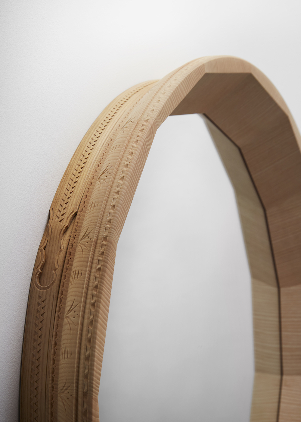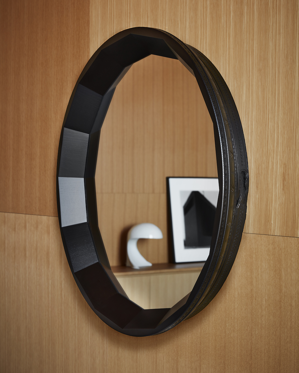 The Heritage Wall Mirror’s silhouette was initially inspired by deconstructing a classic Fahreimer (Alpine milking pail), stripping it back to its essence. The frame’s inside reveals sixteen geometric facets, referencing its construction method, contrasted with a round exterior—all held together by a “belt.”
