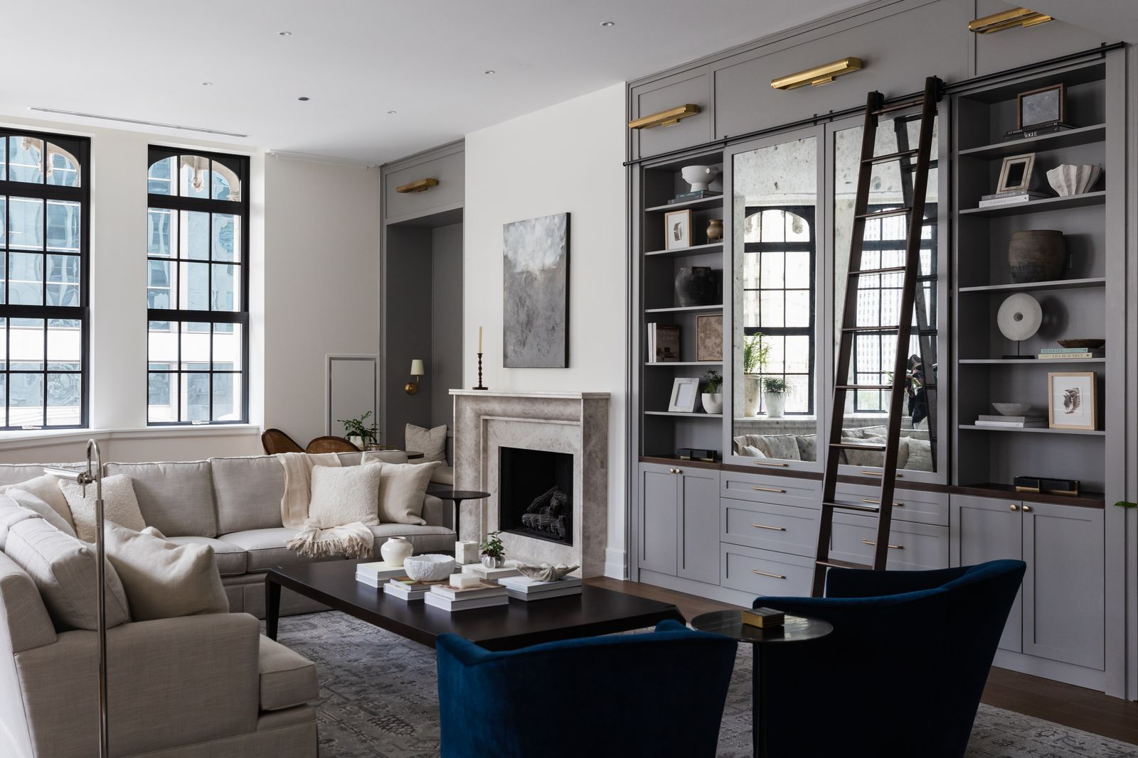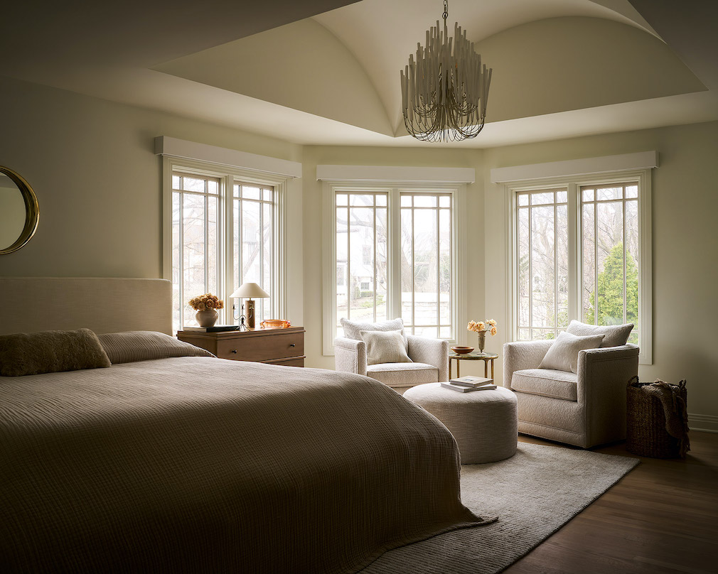 Achieving stylistic cohesion throughout the home was a major focus for the project, with some areas requiring a heavier design hand than others. The kitchen, for example, was among the rooms the homeowners had already remodeled, and Wagenbach notes “it still made sense, but needed some updates” to make it feel connected to the home’s new interior focus. The existing rich blue of the built-in cabinetry in the breakfast/pantry space can now be seen reflected in the undertones of natural stone in various spaces throughout the home, a soft echo of the bolder blue statement the homeowners already enjoyed.