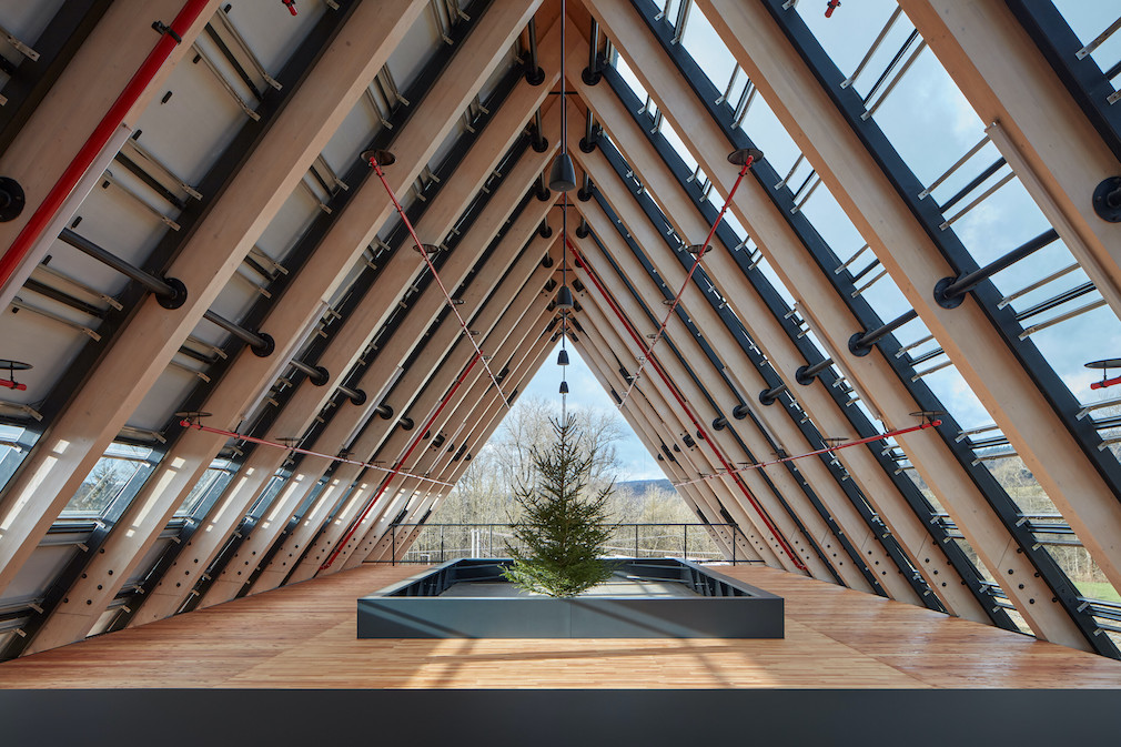 The building design shows the way for future construction projects. Environmentally responsible, the load-bearing structure is made exclusively from timber, a material that is produced on-site, in the Kloboucká lesní production hall located only a hundred meters away. Wood is the oldest and the simplest of materials, but the production process is very modern. As a flagship product of the company portfolio, glued laminated timber was used for the building frame. Repeated many times, the traditionally shaped frame forms an elongated and elegant volume.