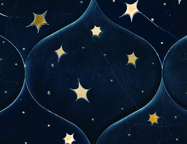 Astronomy, a waterjet stone mosaic, shown in Venetian honed Nero Marquina and Brass, is part…