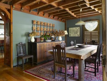 The kitchen island is a “Frankenstein table” Matt Hausmann built from various other pieces of…