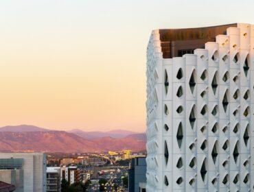 Populus Denver rises from a triangular downtown lot, a constraint that inspired the building’s striking,…