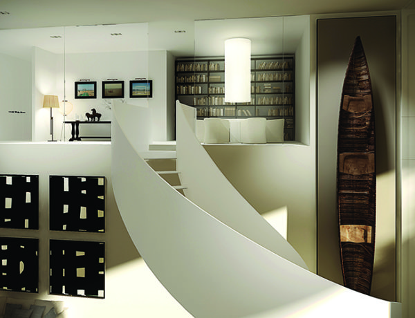 Darks and whites contrast dramatically in the dining room, echoing the light and shadow play…