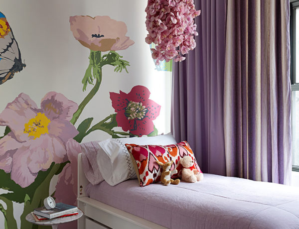 The view outside this dreamy floral bedroom in New York City may be urban landscape,…