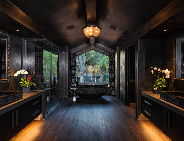 An inky black master bath integrates an enigmatic mix of interesting textures, surfaces and patterns…
