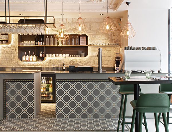 A bar by Brett Design, woven high-back bistro chairs and a simply patterned Holland &…
