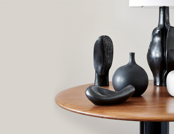 A tablescape on the round wooden Starr table by French contemporary designer India Mahdavi includes…