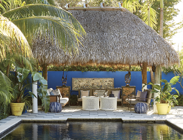 A mature grove of leafy palm trees lines the walkway to James Duncan’s white-washed Ridgewood…