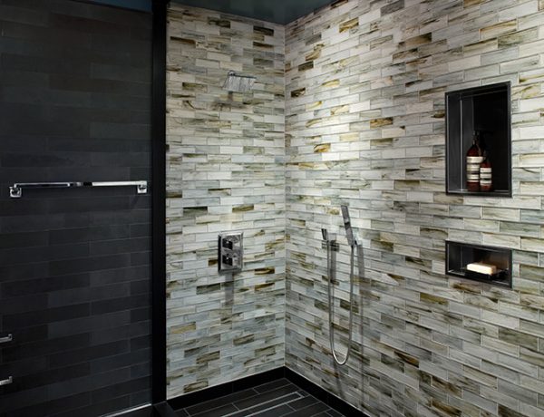 Basalt and Glass Tile Bathroom by Complete Tile Collection | Bold color and dramatic contrast…