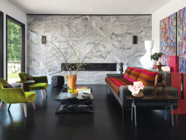 In the living room, Gioi Tran clad the fireplace and entire wall in Italian marble,…