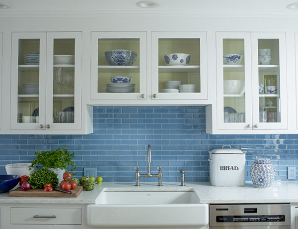 A farmhouse feeling permeates the kitchen tiled in glass subway tiles. Cabinets gleam with white…
