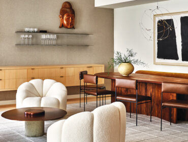 Raymond transformed the uninspired living room of this East Hampton home into a more open…