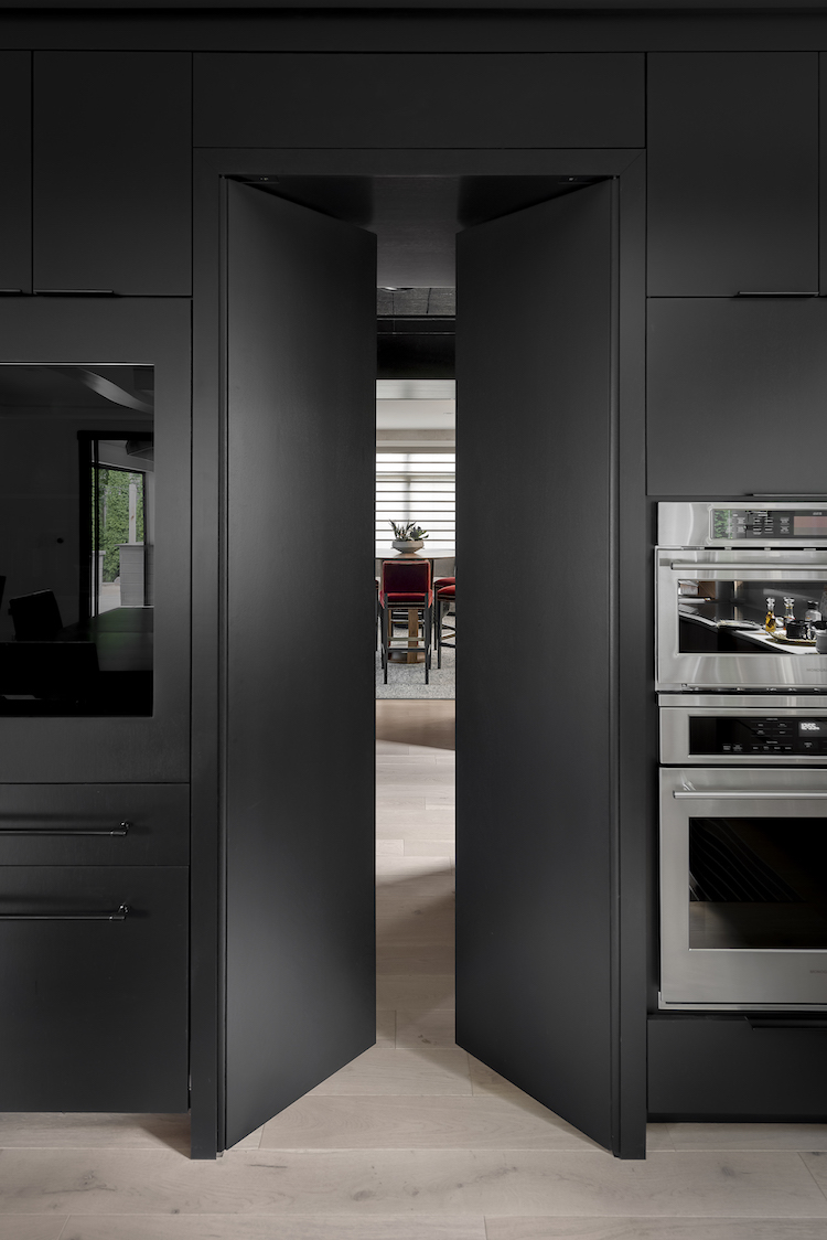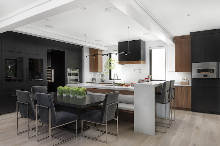 The kitchen is connected to the wine room via the all-black butler’s pantry, which has “secret doors.” Collander explains, “When the doors are closed, they blend in with the kitchen cabinetry as well as the wood-paneled wall in the wine room, and when they’re open, they blend in with the pantry cabinetry.” Instead of having the dining area separate from the main living space, the designers included it in the larger kitchen. They created a “mega-island,” with bar-height seating, banquette seating, and a large expandable dining table that interacts with the great room. The clients also wanted high-tech functionality. The induction cooktop can be operated by an app, and a Galley sink comes with inserts perfect for food prep, serving and clean up. There is a pizza oven that can cook a pizza in 90 seconds but can also braise meat perfectly. Though the space is modern, the designers did not want a clinical atmosphere. Collander says, “Walnut was our first pick. It has a richness and a beautiful range of colors while balancing nicely with a pre-finished white oak floor. Slab cabinets in walnut warmed up the space while black-stained oak cabinets provided contrast and depth. Quartz countertops and walls kept the space bright and clean.”