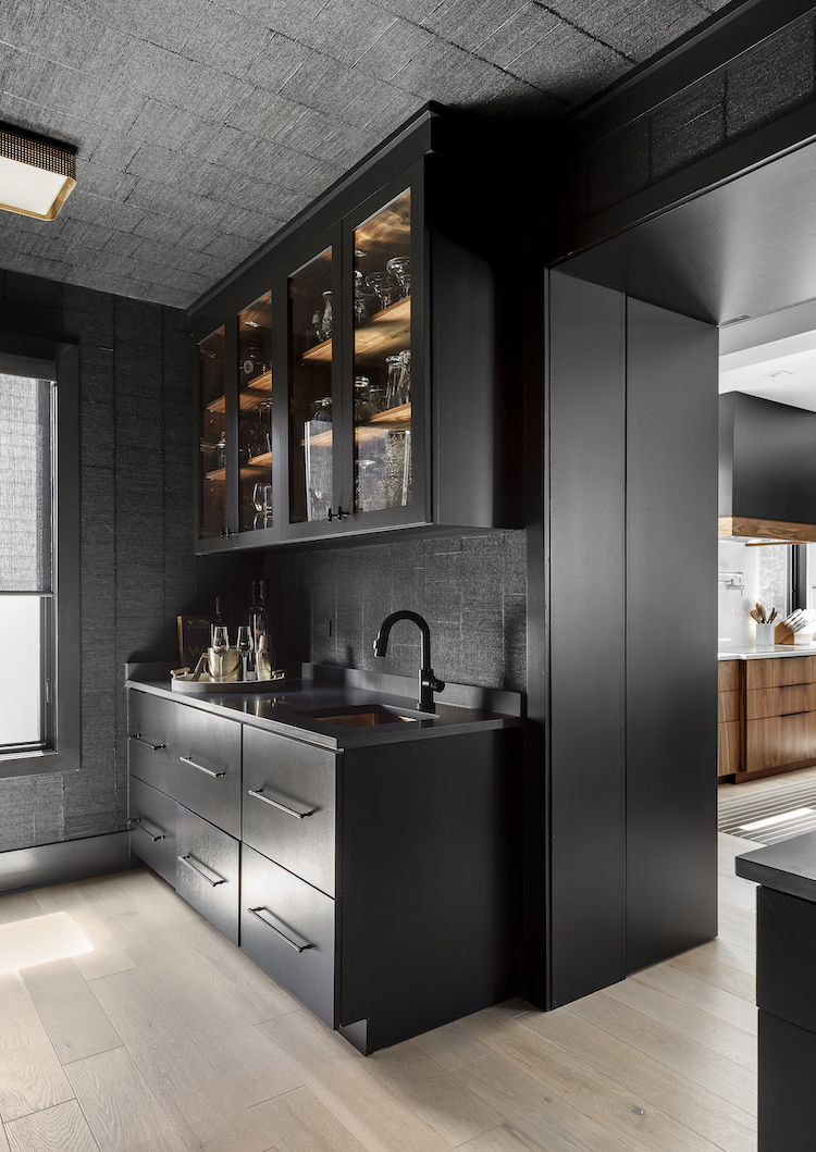 To add interest to the mostly neutral palette, the designers added layered texture in wallcoverings, upholstery, and finishes. Wide-plank, white oak flooring runs throughout the home and is the base of the design. In the wine room, a cork veneer is covered with metallic paper with a subtle shimmer. Black grasscloth envelopes the pantry, and black wood veneer in a chevron pattern covers the great room’s fireplace wall. In the powder room, they used a wood-look vinyl in a geometric pattern that coordinates with walnut paneling on the lower part of the wall.