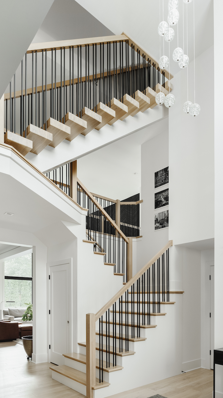 Chase and Collander agree that converting the attic into a third floor was the biggest transformation in the house. They added a floating staircase that can be seen from the foyer. The unused space was quite large, so they converted it into a home office and lounge space complete with a wet bar and powder room. The design is masculine and modern with an oak waterfall desk and matte black accents. Storage cabinets line the perimeter of the room to make use of the vaulted roofline.