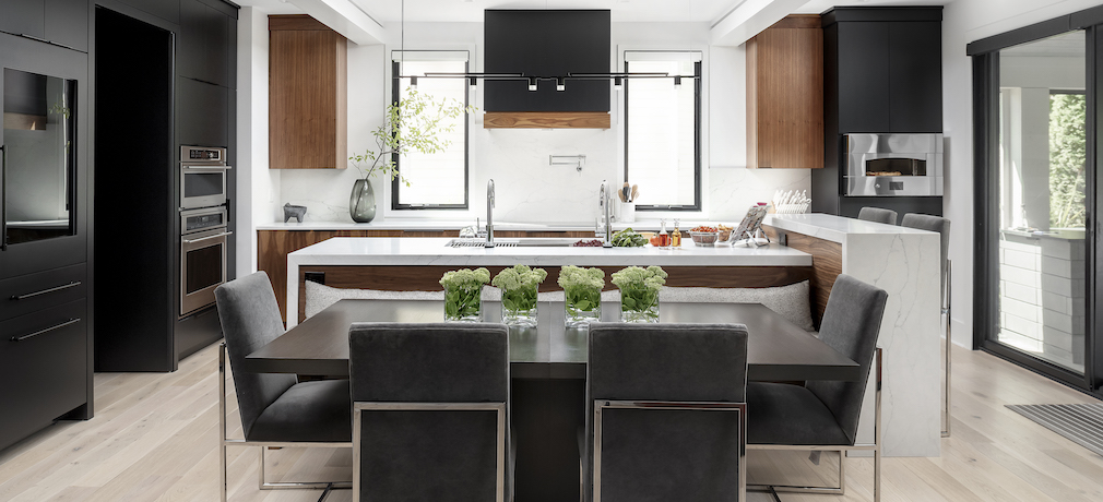 The kitchen is connected to the wine room via the all-black butler’s pantry, which has “secret doors.” Collander explains, “When the doors are closed, they blend in with the kitchen cabinetry as well as the wood-paneled wall in the wine room, and when they’re open, they blend in with the pantry cabinetry.” Instead of having the dining area separate from the main living space, the designers included it in the larger kitchen. They created a “mega-island,” with bar-height seating, banquette seating, and a large expandable dining table that interacts with the great room. The clients also wanted high-tech functionality. The induction cooktop can be operated by an app, and a Galley sink comes with inserts perfect for food prep, serving and clean up. There is a pizza oven that can cook a pizza in 90 seconds but can also braise meat perfectly. Though the space is modern, the designers did not want a clinical atmosphere. Collander says, “Walnut was our first pick. It has a richness and a beautiful range of colors while balancing nicely with a pre-finished white oak floor. Slab cabinets in walnut warmed up the space while black-stained oak cabinets provided contrast and depth. Quartz countertops and walls kept the space bright and clean.”