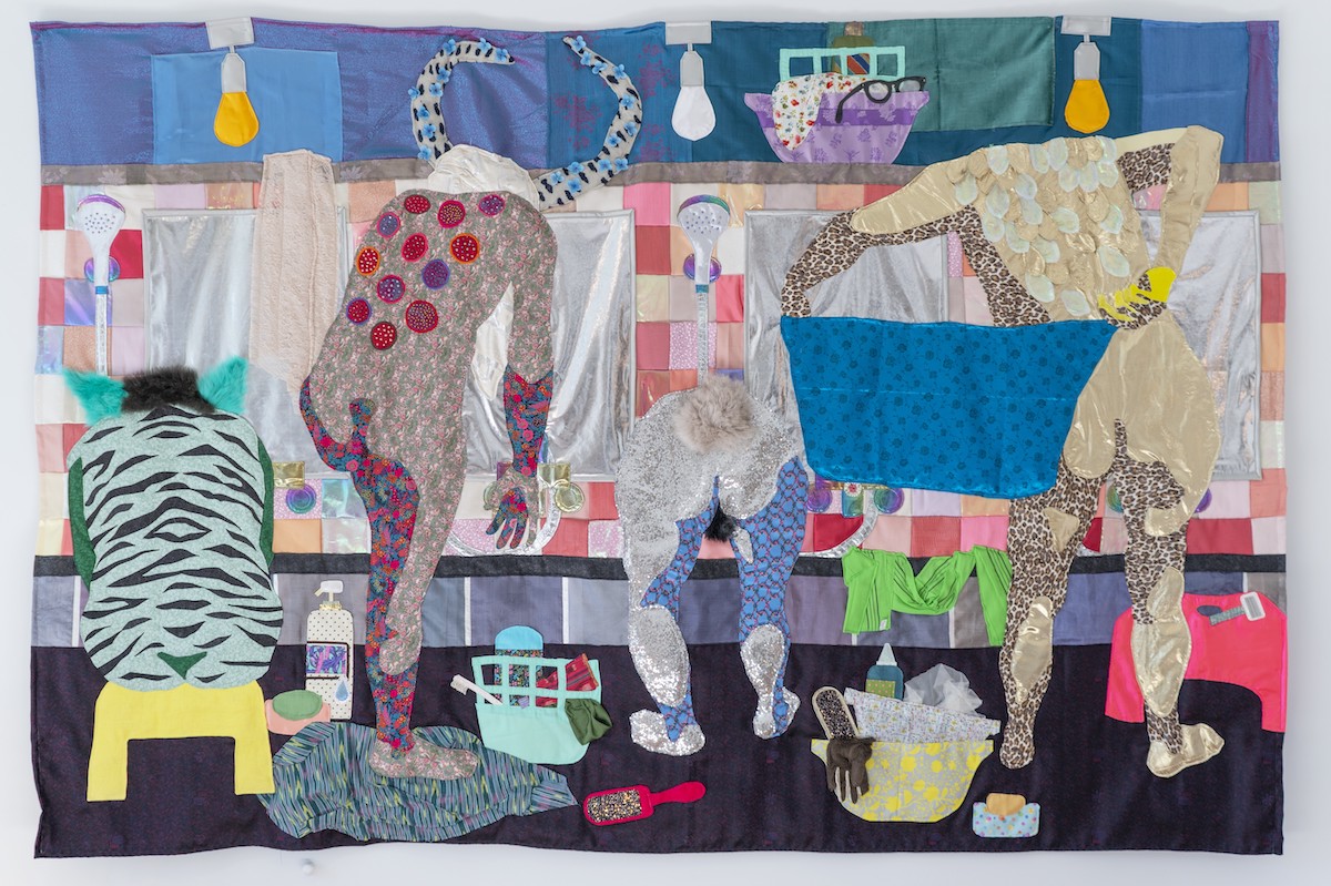 The norms of bodily expression in various cultures are further explored by textile-based artist Woomin Kim, who draws upon her Korean identity to examine differing perspectives on sexuality within a patriarchal world. In Mokyok (Bathhouse) (2023), for example, Kim highlights the lack of self-consciousness among individuals of different ages who gather in Korean bathhouses, and contrasts this with the far more private dispositions of individuals in the U.S., thus illustrating the dichotomy between private and public spheres and shedding light on distinct societal attitudes towards personal space and community.
