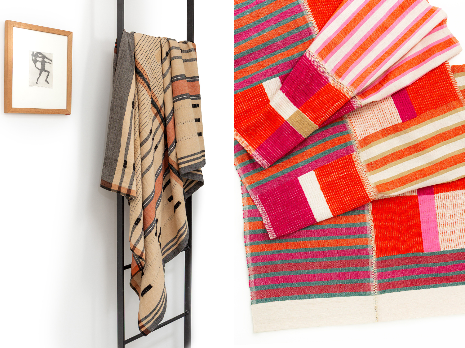 The khasa blanket and kpoikpoi hanging were reimagined into two throw designs. For the khasa, Getachew distilled the motifs into a minimalist composition of stripes and dashes that mirror the scale and proportions of the original. With the kpoikpoi, a more playful approach was taken, utilizing a palette of vibrant poppy, pink and orange. Each throw is paired with coordinating table linens that extend the themes of the textiles into the home. The embroidered woman’s wrapper was transformed into a hand-embroidered scarf, made in Brooklyn in collaboration with textile artist Krystle Collins.