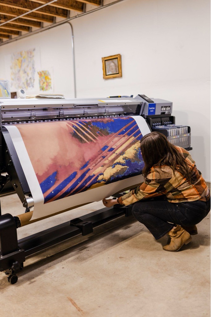 EPSON Wide-Format Dye-Sublimation Printers are the machinery that allows our imagination to manifest in textile form. An operational art form in itself, these revolutionary printers support our vision to print sustainably by using zero water (aside from the non-toxic water-based disperse dyes in our printheads) and far less electricity than traditional textile printing processes, which still account for over 95% of worldwide textile print production.