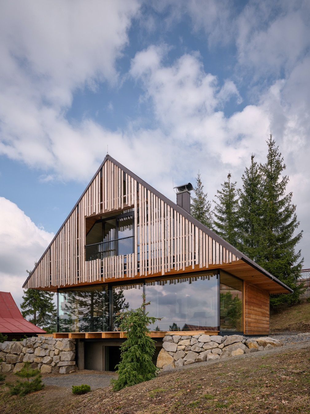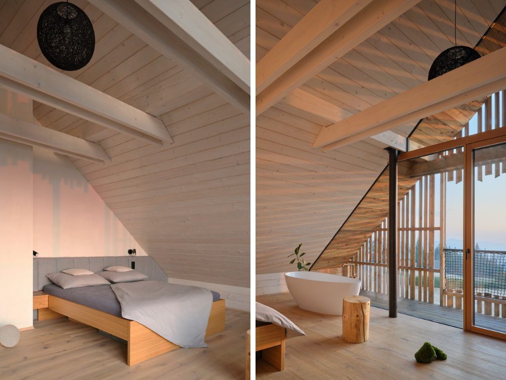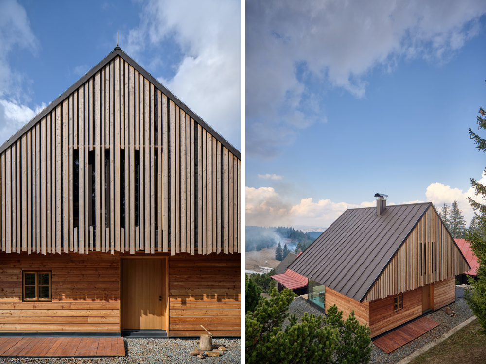 Perched on a sloping site in the Javorníky Mountains, this contemporary timber house reinterprets traditional Wallachian architecture while opening up to spectacular valley views. A log construction with a gabled roof merges with the landscape, its eastern façade recalling a classic Wallachian cottage, while the western side opens to the surroundings through large-format glazing. Prefabricated sandwich timber panels enabled rapid on-site assembly, and the house relies on passive solar energy and a heat pump for a year-round low-energy climate. The design, handled by SENAA Architekti, balances tradition with modern technology, creating a contemporary mountain retreat sensitive to site, climate, and function.