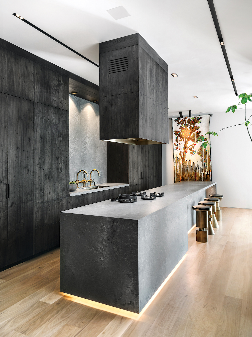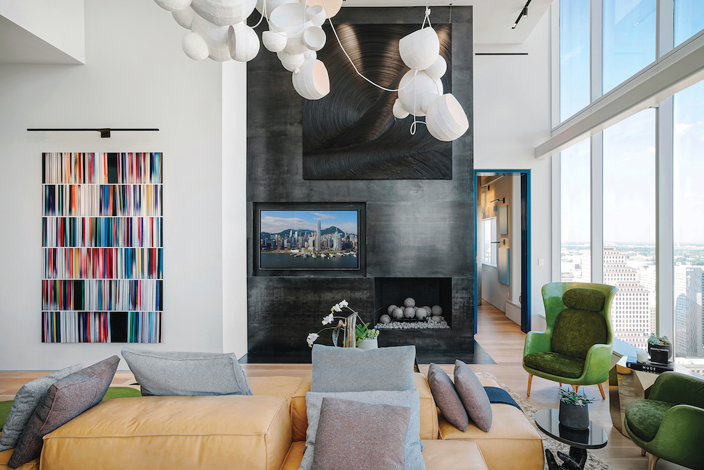 Filled with artwork collected from around the country as well as custom pieces conjured by Schoos, the penthouse becomes a sculptural showpiece where everything, from the balls of the chandelier in the living room that are suspended by invisible fishing wire to the kitchen island whose bottom is illuminated, appears to be floating.