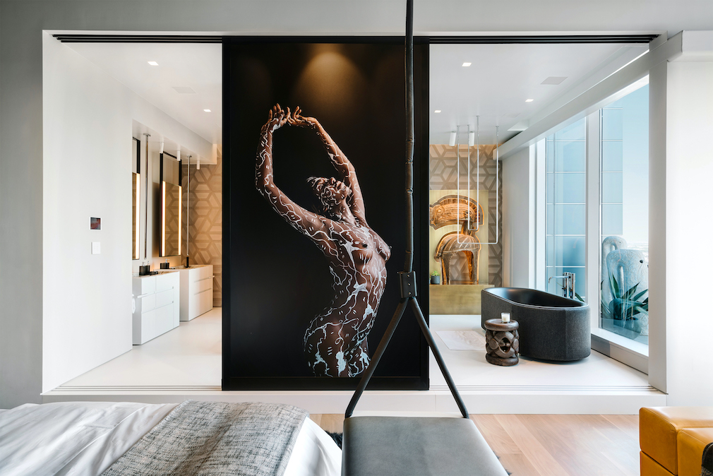 And no wonder. In addition to the swing, there is a TV whose back doubles as a mirrored headboard for the bed and an elaborate Art Nouveau chandelier that Schoos turned into an illuminated ceiling sculpture. A trio of enormous sliding doors, adorned with larger-than-life photos of dancing women, separates it from the bath, which features a tub covered in linen fabric and an astounding view of downtown through a wall of glass.