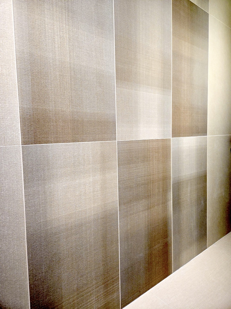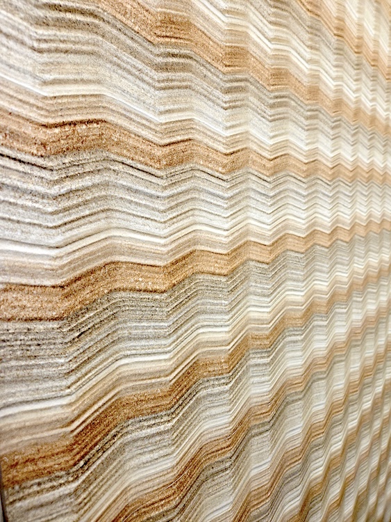 Ever dream of bringing the rich look of upholstery to a wall where it would be worn away? Tile is increasingly a way to deliver that sense of sumptuousness. For example, we saw some amazing porcelain made to resemble leather right down to the feel of its grain and hand stitching. But without a doubt, the fabric-look story of Coverings 2026 came from Florida Tile, which is part of Panaria Group. Their Threadscape collection boasted the completely convincing look and feel of plaid linen in a variety of blues, browns and other shades appropriate for men’s suiting. We even snagged one of the coveted scarves available that proved an uncanny match.
