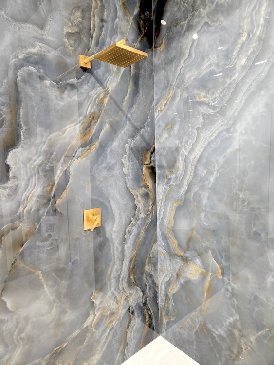 Gold was having a moment at this year’s show. We saw examples from dazzling, full gold-leaf looks to spectacular mirrored mosaics that seemed pieced together by a jeweler’s hands. But even where it was used as an undertone — such as within this Incanto Onyx Blue from Ragno, the color application has evolved to give golden steaks the surface an inner light — seemingly designed to rival fixtures for the title “jewelry of the bath.”