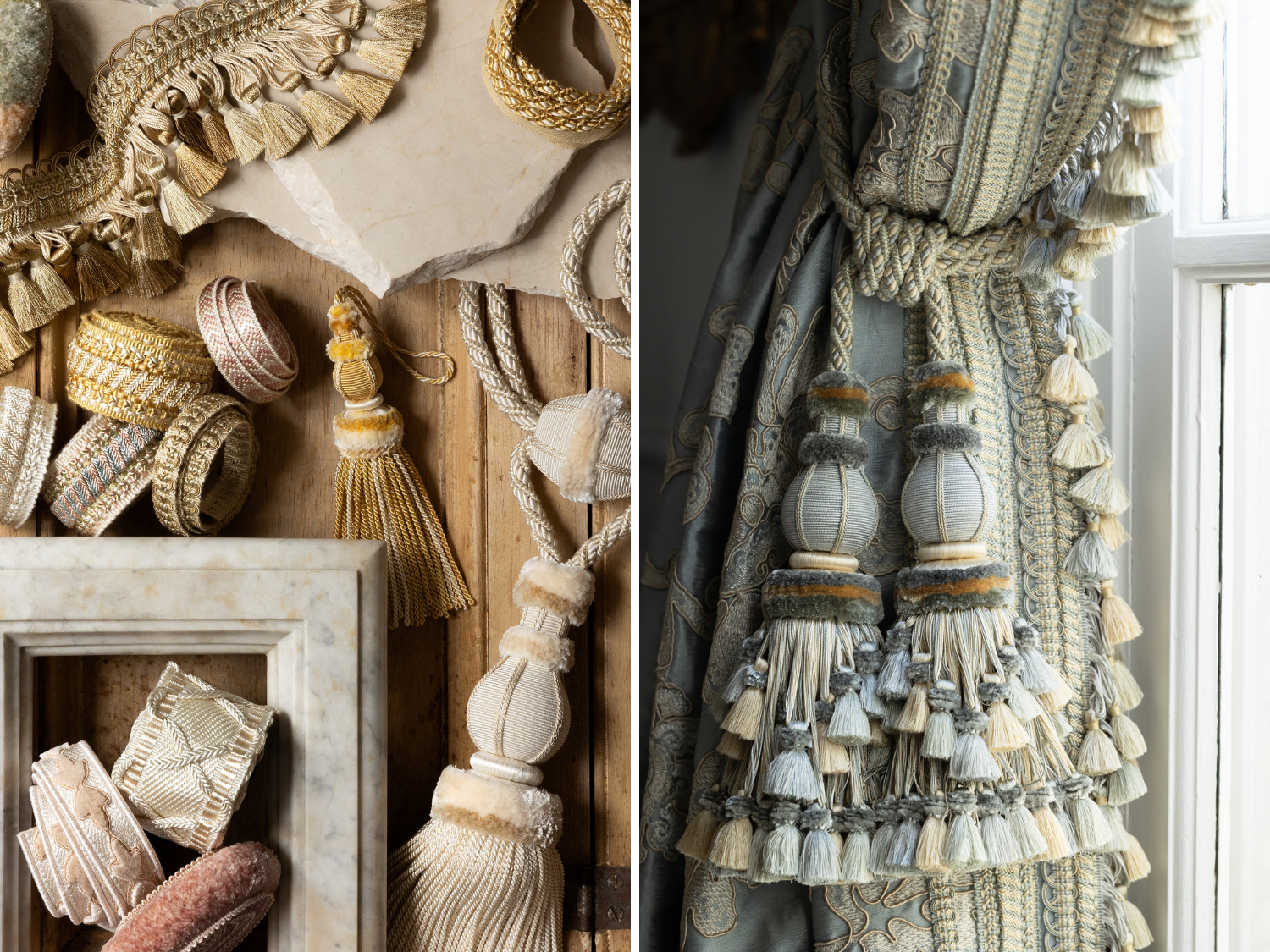 The French Neoclassical period is a direct result of the revival of interest in classical (both Greek and Roman) architecture and design. Like all design trends, it took from the past and re-interpreted it for the mid-18th to the early 19th century. The Bagatelle collection is very much the same, in that it draws upon some of the design motifs of that earlier period but presents them in fresh new ways in terms of construction and mixture of styles in the same piece, whether it is a tape or tassel.