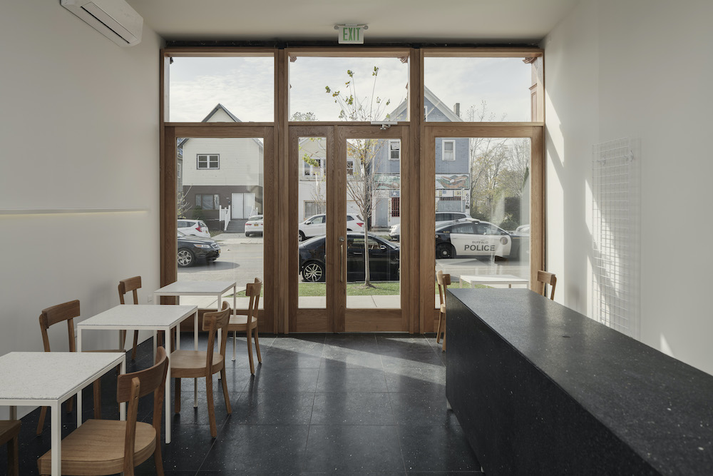 Across the renovation, the material and color palettes are clean, neutral, and cohesive, further emphasizing sightlines through dividing walls. Black terrazzo tiles line the interior floor, from the front café to the back cat environment, while matching terrazzo counters and benches extend into both zones creating mirrored volumes. Interior walls and window frames are either painted white, light gray, or clad in light wood (white oak plywood, poplar), and hardware is stainless steel and natural anodized aluminum. “The idea was to use resilient materials like terrazzo, so that the inside could withstand time as well as the outside brick shell has,” says Davidson. “And the subdued palette is meant to highlight whatever specific, programmatic elements end up being planted in the space.”
