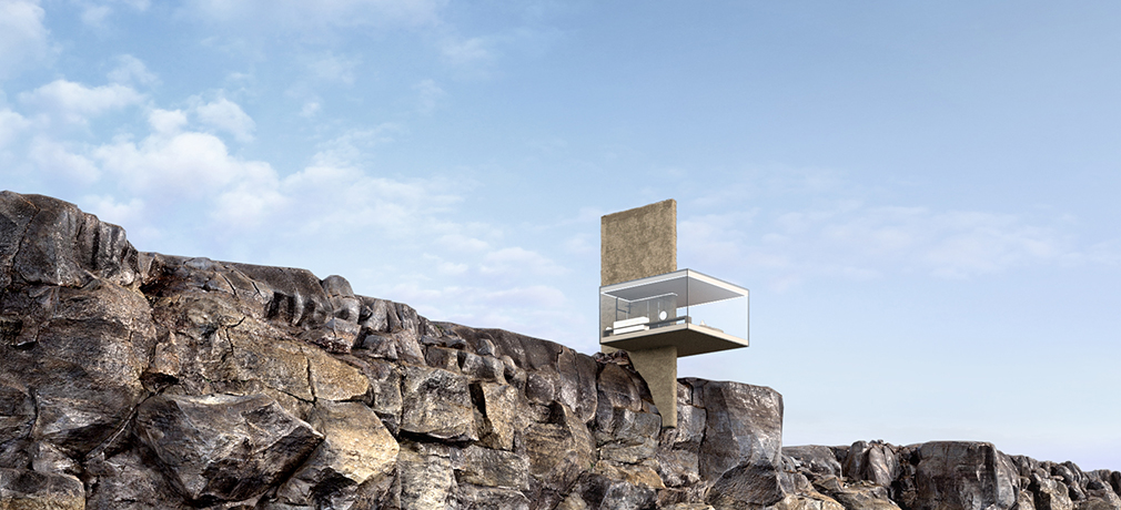 The idea behind this minimalistic cliff cabin is to create a feeling of weightlessness of the architecture overlooking the ocean. A 270-degree glass structure is nestled into the rock and stands a bit in front of the cliff, provoking the sense of “impossible architecture”. However, the building, which is set on the vertical pillar and secured with the foundation made of recycled concrete, is absolutely equilibrated.