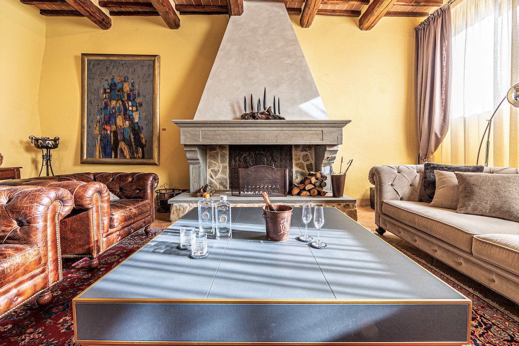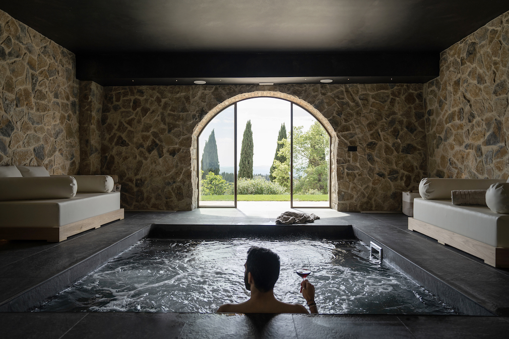 Scali and Lewis worked with leading Florence architect Massimo Pieratelli to revamp the property, which opened in summer 2023. “We wanted to preserve rustic elements but do it with a high level of luxury,” explains Scali. Original details such as exposed beams and terracotta ceiling tiles were left intact, along with perfectly imperfect centuries-old curved interior stone walls.