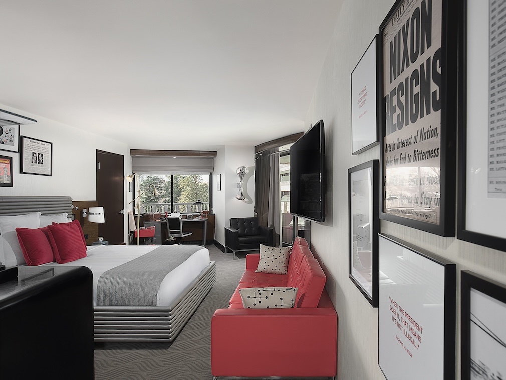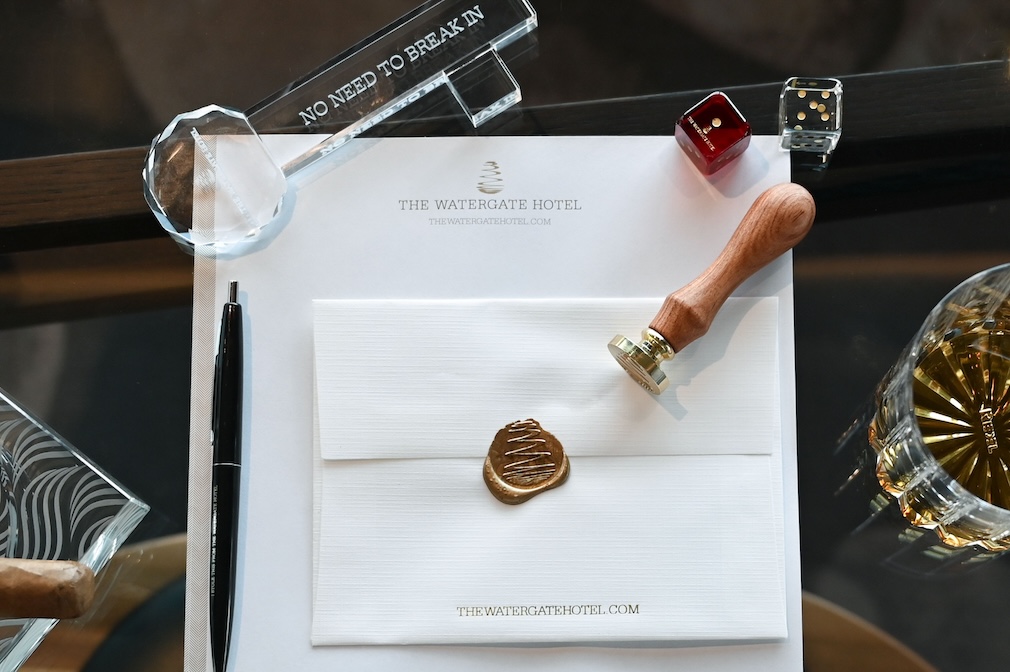 The hotel fully embraces its scandalous past with a wink and a nod. Just off the lobby, there’s a gallery wall showcasing framed magazine and newspaper covers about the Watergate break-in and Nixon’s resignation. Hotel key cards are emblazoned with “No need to break in” and tiny images of Nixon appear in the pastry tier at the history-inspired “Spill the Tea,” where nibbles are inspired by presidents’ favorite foods.