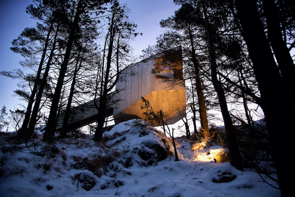 A tiny cabin hovers above the pine-clad slopes of a rocky outcrop, tucked out of sight of passing satellites. Poised on slender steel columns with its angular exterior brushing against branches, this futuristic structure appears intent on getting back to nature.