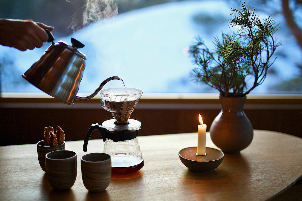 The cabin interior is flooded with natural light from all sides, including the ceiling, uninterrupted by the glass balustrade of the tiny balcony beyond the door. Guests wake each morning to the sensation of being directly suspended in the forest canopy. The compact kitchen comes complete with hob, basin and fridge; all built into a sweeping, stylish counter that hints at Hardy’s admiration for the work of Danish design legend, Arne Jacobsen. Steam serenely curls from a funnel’s filter paper, beside a newly lighted candle: the essence of a tranquil afternoon in this winter hideaway. Though perfect for three, the cabin can sleep up to a family of five (or just very good friends!), thanks to an additional pullout bed beneath the built-in bunks. The restricted palette of natural materials lends a monastic simplicity to the tiny living space, with plain, varnished oak and brown leather upholstery. The craftsmen of Sigurd Lende AG constructed all the bespoke beds and cabinetry.