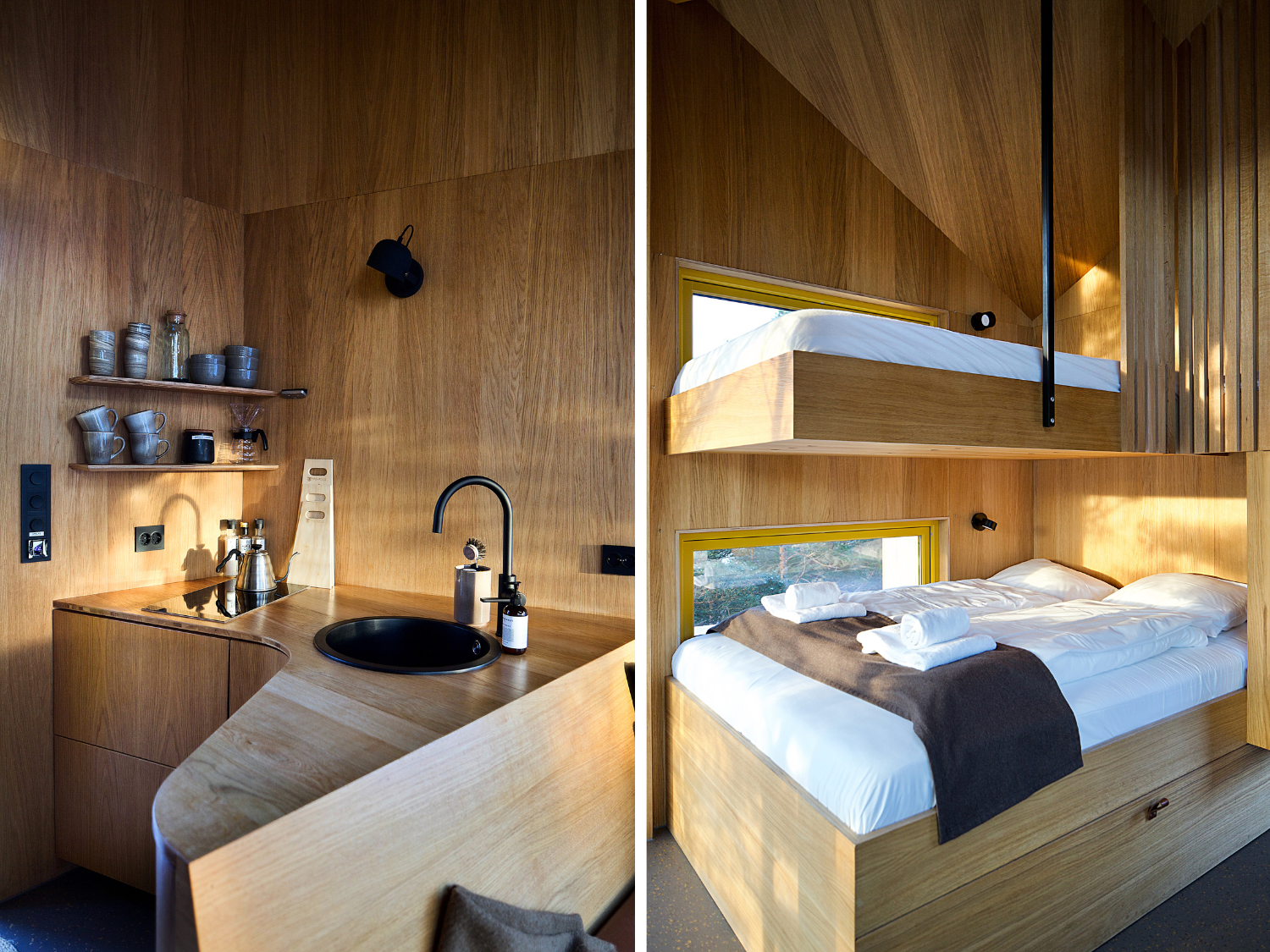 Above and below the steel base, the cabin’s timber framing is clad entirely in a specially treated, pine-based product, Accoya, that is highly stable and rot-resistant. The irregular shapes of the yellow-framed windows sit flush with the cladding, as though the cone’s woody scales have been peeled off to let in the light. Remarkably, Hardy managed to pack a kitchen, shower, eating area and sleeping bunks into a floor area of just 161 square feet.