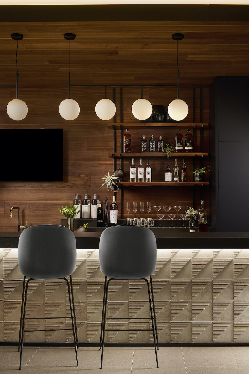 “We were big on keeping the spaces on the upper levels light and airy with the occasional dark accents,” he explains. “And on the lower terrace level (where the bar and theater are), we did the opposite by selecting dark, rich finishes for the walls and lighter furnishings as accents.”