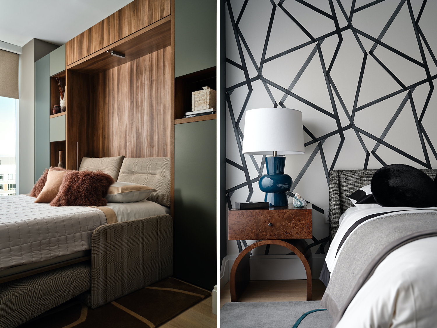 But the space also presented challenges, including smaller bedrooms. In the primary, Fulmer compensated by keeping the furniture low to the ground. “I had to carry the eye up visually without feeling weight,” he asserts. “We found this great wallpaper pattern; it almost felt more like a mural” and offered the feel of a full-wall headboard. Meanwhile, he unlocked the guest bedroom’s multifunction potential with a Murphy bed, recessed lighting and ottomans pulling double duty.