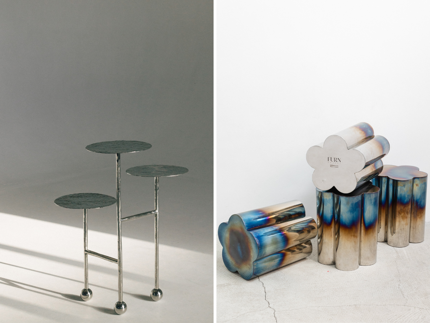 Designed by Sergii & Anna Baierzdorf, the Liquid Table (left) was inspired by water and the versatility of metal, its visual qualities, sound, and physical properties, while the Barvinok coffee table is inspired by the periwinkle flower, one of the cultural symbols of Ukraine.