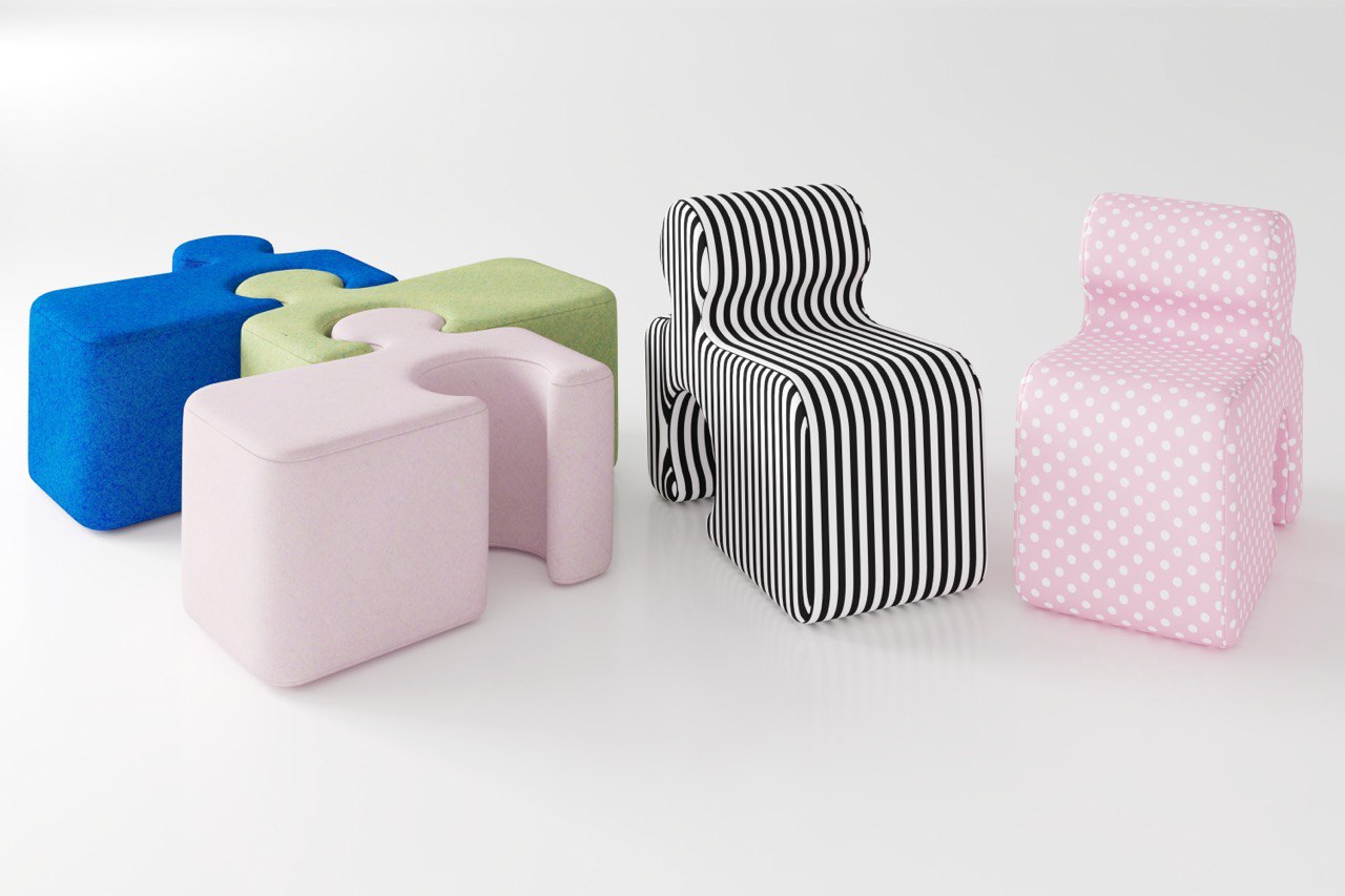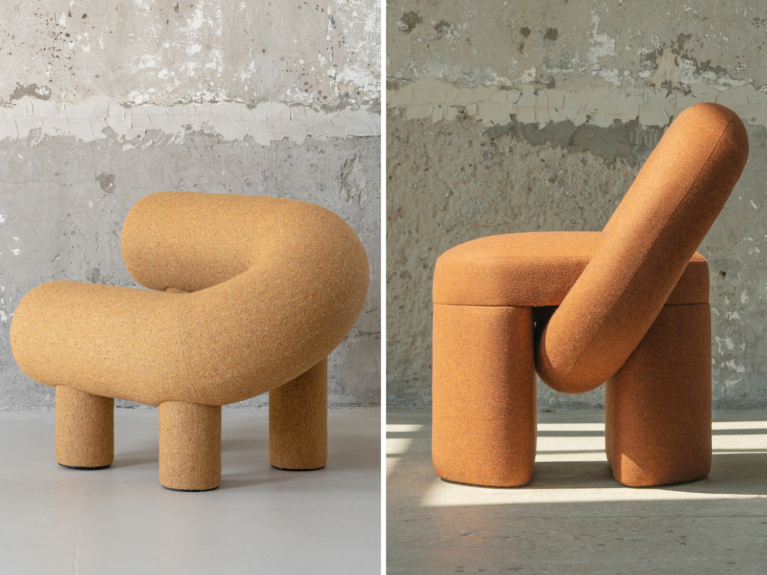 With Umi (left), designer Rostislav Sorokoviy aimed to create an object that resembles a soft sculpture rather than a piece of furniture. Similarly, designer Dmytro Kozynenko was inspired by texture and oversized geometric shapes in creating the Play armchair.