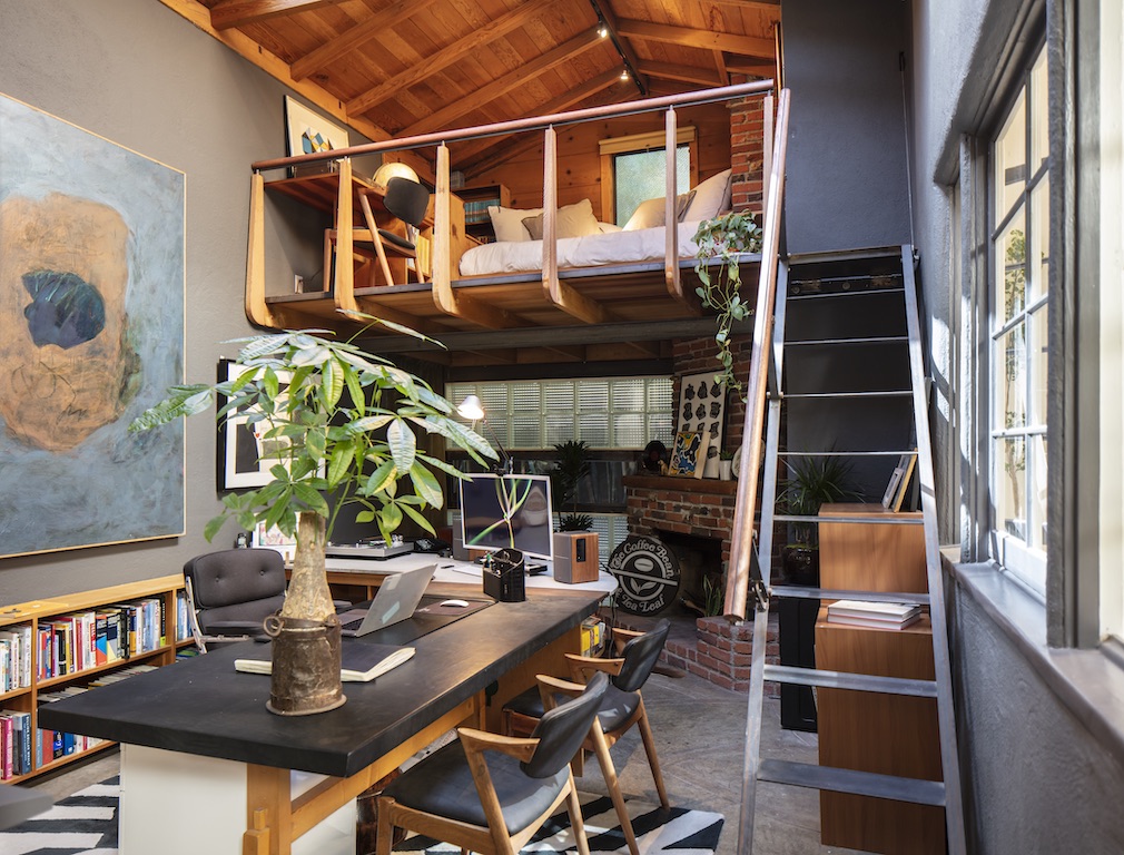 One such hybrid space is the living room, which is located in an old glass-domed atrium with an arched fireplace designed by Katselas’ using rusted metal to simulate grasses on one side and diagonal wood inserts on the other. The space was completely rebuilt but preserves original details and opens to the dining room, which is completely new. Another is Elias’ office, which doubles as accommodations (it has a sleeping loft). It had been a courtyard and retains its footprint, walls and concrete floor. But now it connects to the newly built kitchen, a boxy structure designed by Bradley and featuring a roofline that echoes Katselas’ steel-frame redo of one of the bungalows.